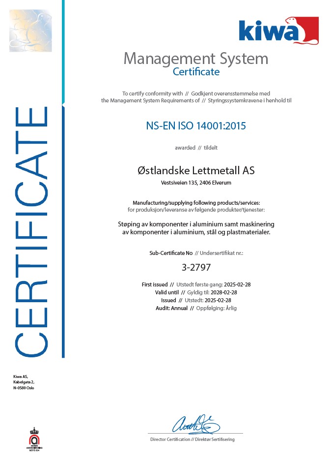 Østlandske Lettmetall AS er sertifisert i henhold til ISO 9001:2015 og 14001.
